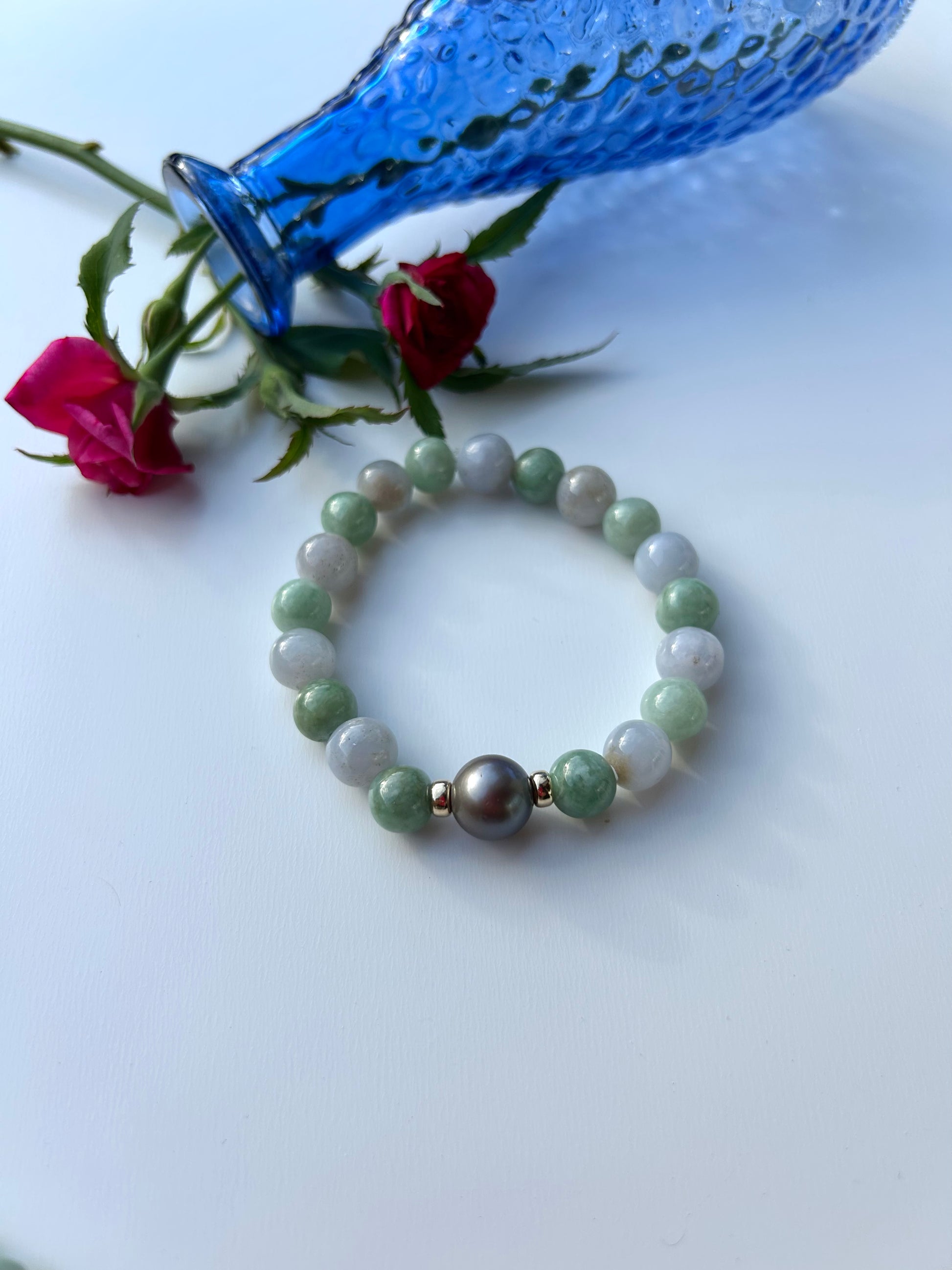 This Jade bracelet features white and green jade & a Large Tahitian pearl finished with 14kt Gold filled beads